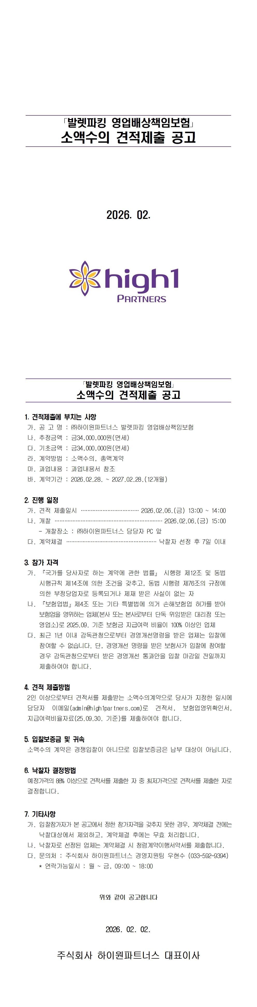 [공고] 「발렛파킹 영업배상책임보험」 소액수의 견적제출 공고